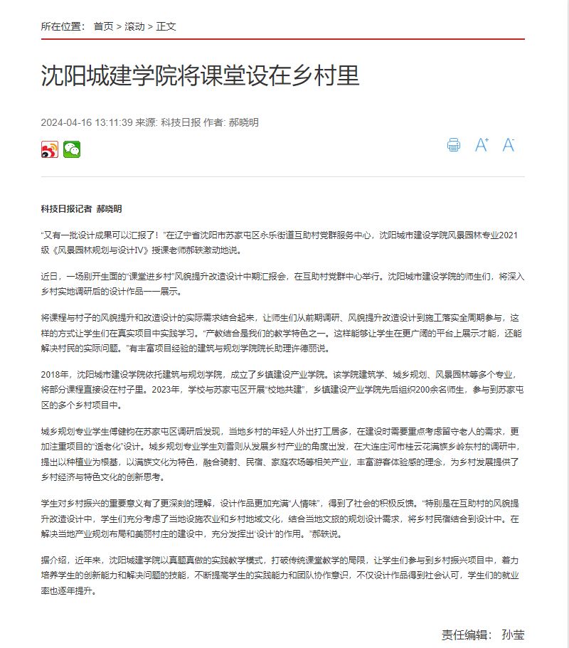 近日,《科技日报》以《沈阳城建学院将课堂设在乡村里》为题,对我校太阳集团tyc234cc(乡镇建设学院)在辽宁省沈阳市苏家屯区永乐街道互助村党群服务中心举行了“课堂进乡村”风貌提升改造设计中期汇报会进行报道,充分展现了学校以真题真做的实践教学模式,让学生们参与到乡村振兴项目中,着力培养学生的创新能力和解决问题的技能。