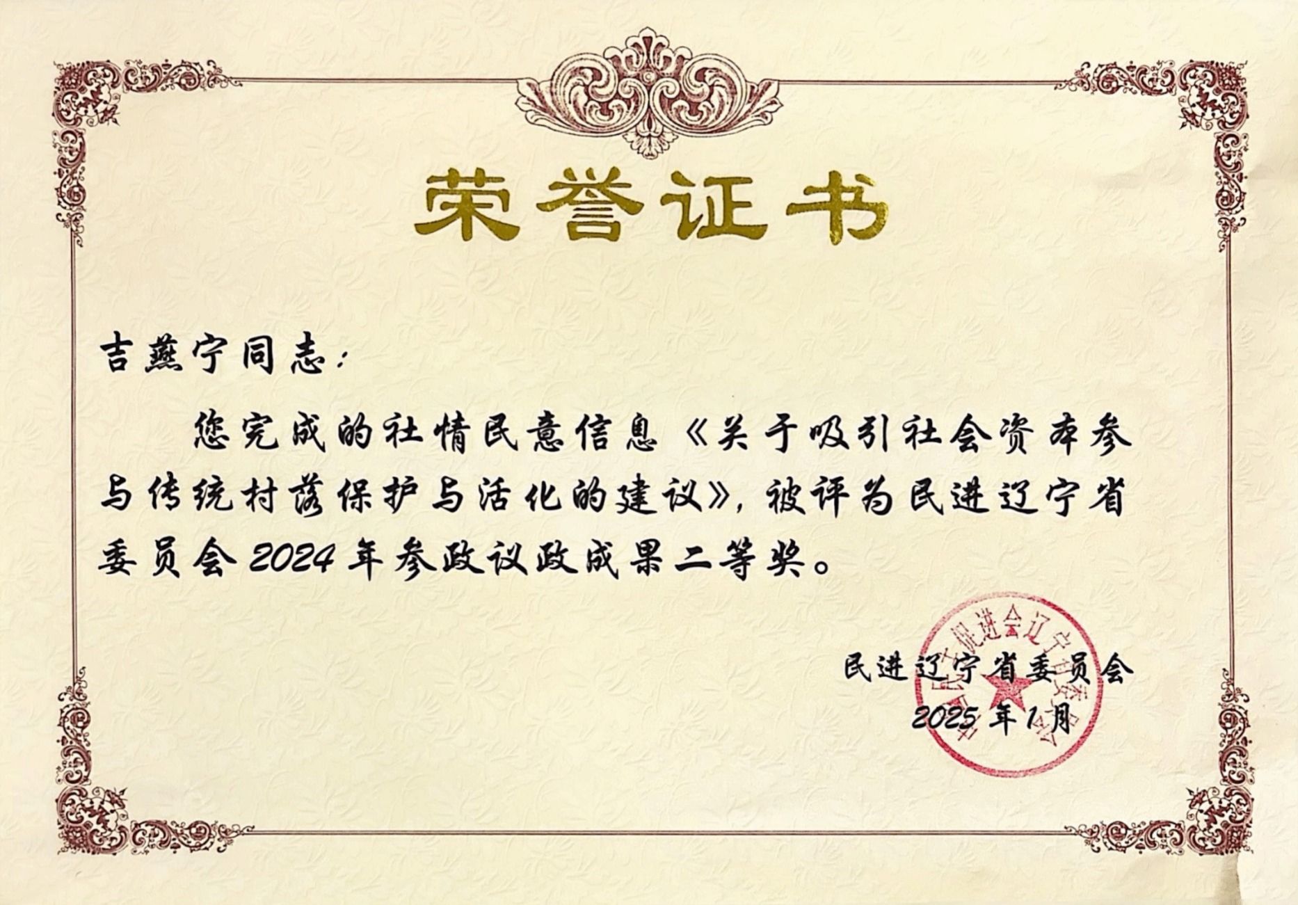 近日,从民进辽宁省委员会2024年参政议政成果评选中获悉,我校太阳集团tyc234cc吉燕宁、黄喆、王超等教师凭借深厚的专业素养与敏锐的社会洞察力,共同撰写的两篇社情民意信息《关于吸引社会资本参与传统村落保护与活化的建议》《关于优化我省老旧小区改造对象界定工作的建议》从众多申报成果中脱颖而出,双双荣获二等奖。这不仅是对我校教师专业能力与社会责任感的高度认可,更是学校长期深耕学术研究与社会服务协同发展的有力见证。